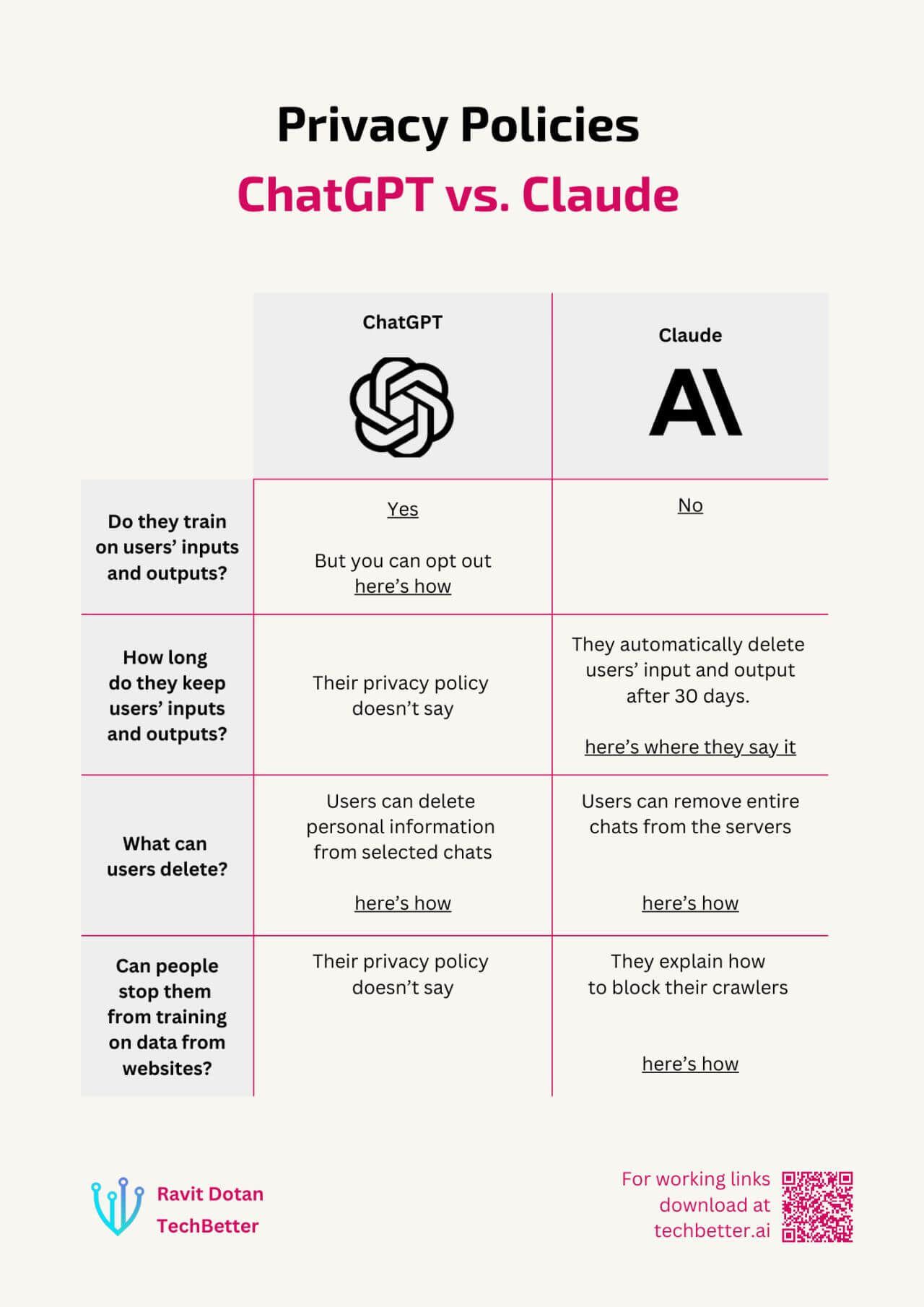 Comparison on privacy policies between free versions of ChatGPT and Claude. Claude wins as it doesnβt train on your data by default and specify how long they keep your records or retain it and allows you to delete entire chats. Credits to Ravit Dotan, PhD on LinkedIn.