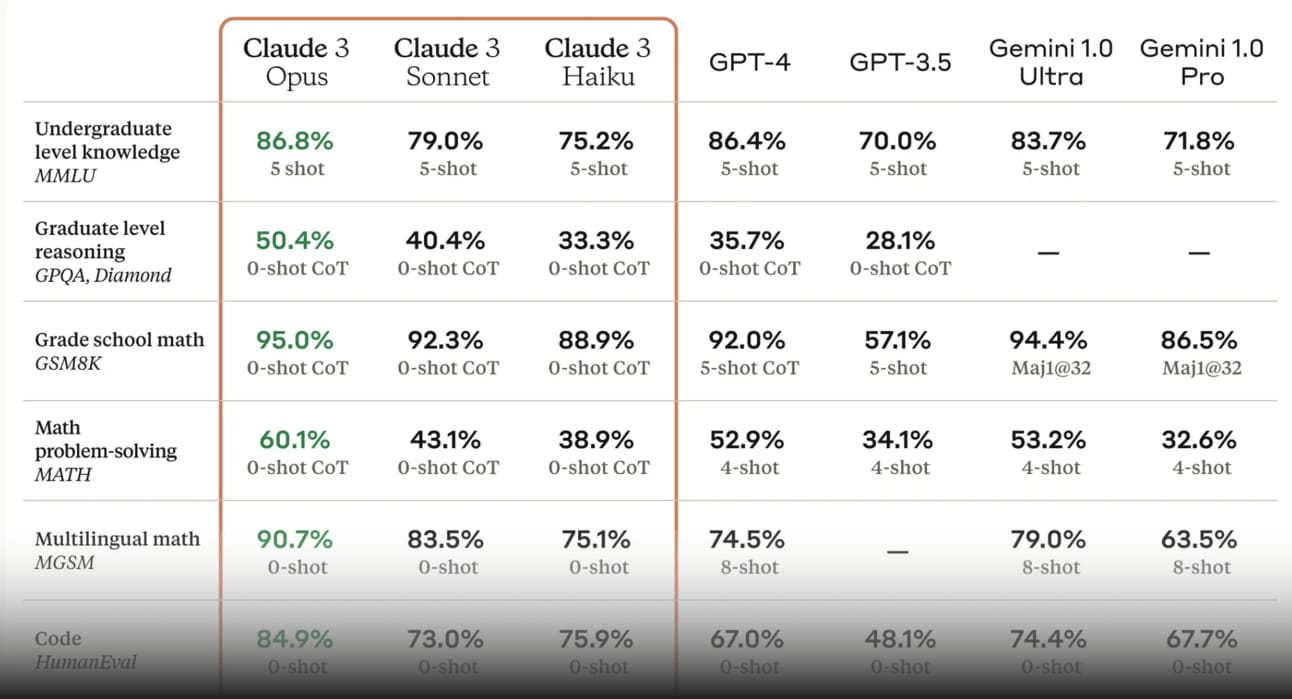 Anthropic launched Claude 3 yesterday. Take a good look at the table above – their latest top-tier model, Claude 3, reportedly beats GPT-4 and Gemini Ultra on major benchmarks, including knowledge, reasoning, math and code. Details: