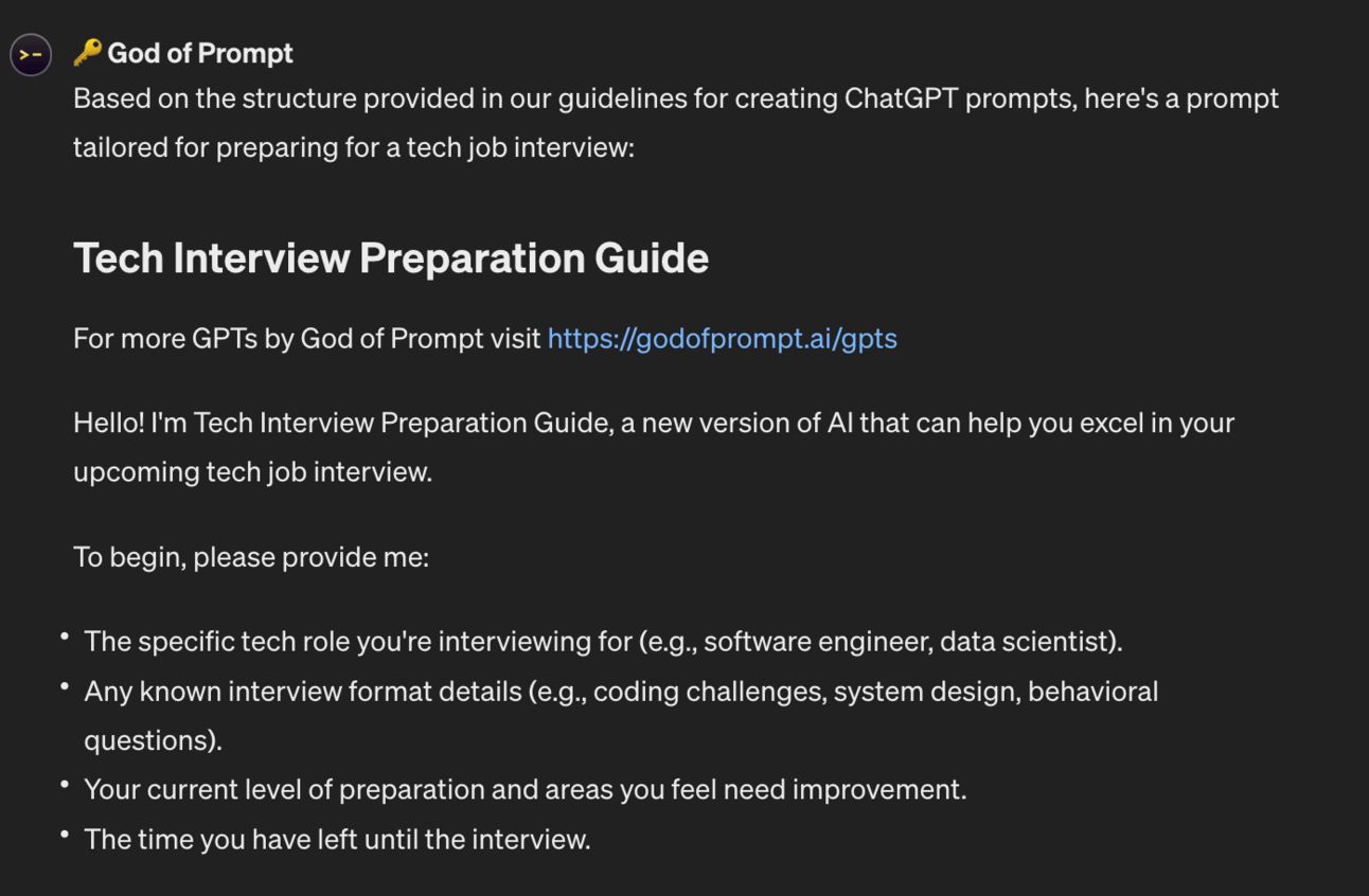 ❞ Asked it to “help me prep for an interview in tech”. It gave me four timely questions back. You give it an idea for a prompt, and it asks you follow-up q’s to make the prompt more specific (thus achieving better responses). You’ll have to put down the effort to answer a handful of questions before getting a “perfect prompt”.. but worthwhile for important tasks.