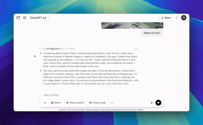Ability to βthink with imagesβ: both of the new models can blend visual and textual reasoning in a new way. They no longer simply βseeβ the image you upload, but use it directly in their chain of thought. They can also edit the image as part of their reasoning, zooming, cropping, transforming. Combining its new tools and visual perception, I reckon o3 might now be the worldβs best geoguesser.