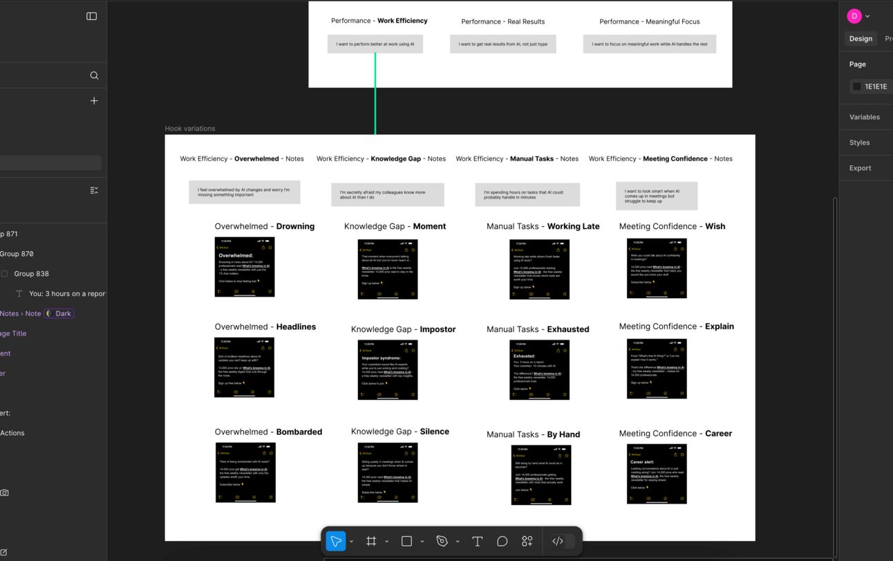 My work-in-progress in Figma with different Meta ad variations. Claude helped on the specific messaging for each one, and suggested a structure with consistent naming.