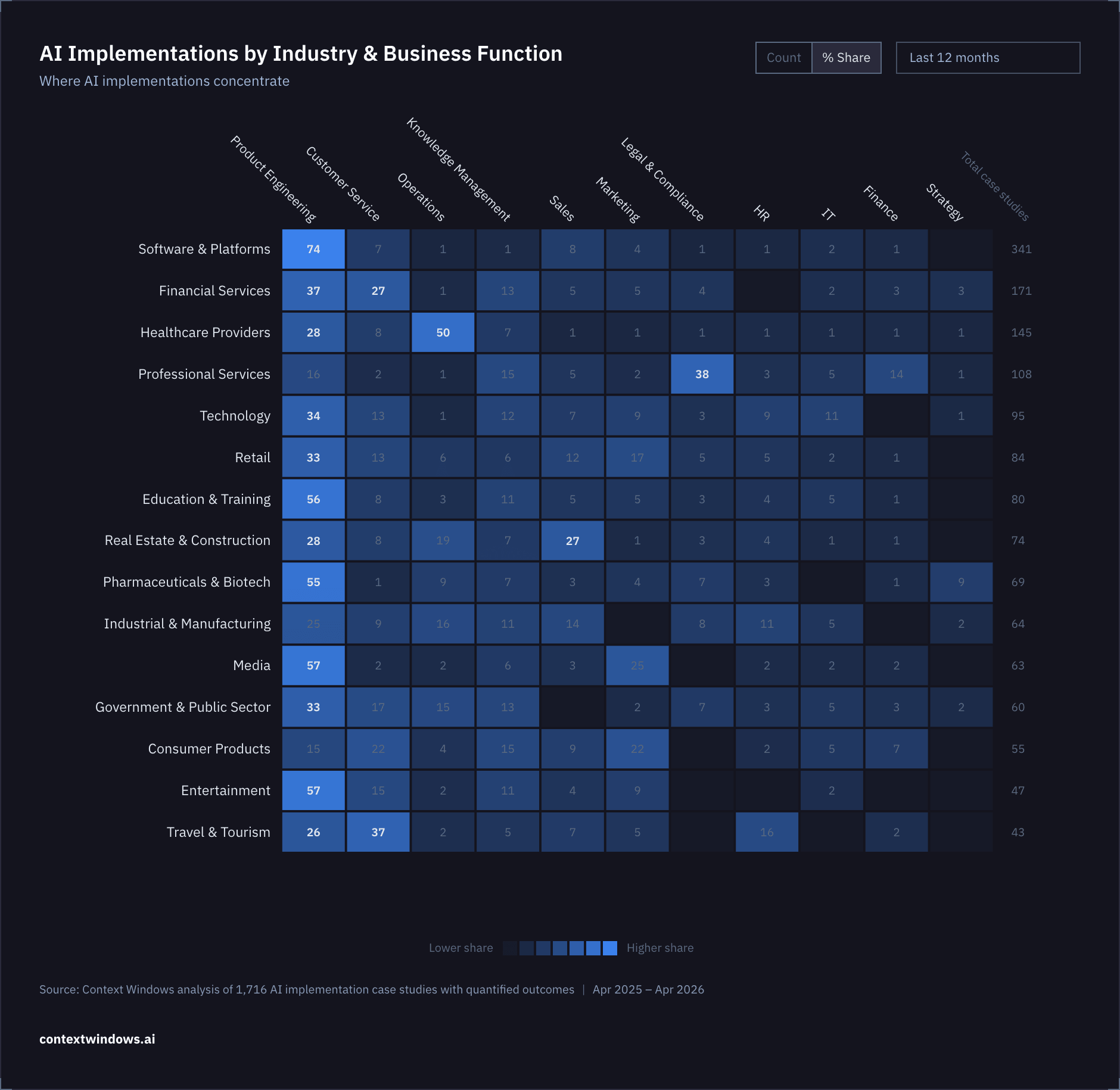 Iβve taken a look at 1,716 AI implementations with quantified results from the last 12 months, and mapped them by industry and job function.