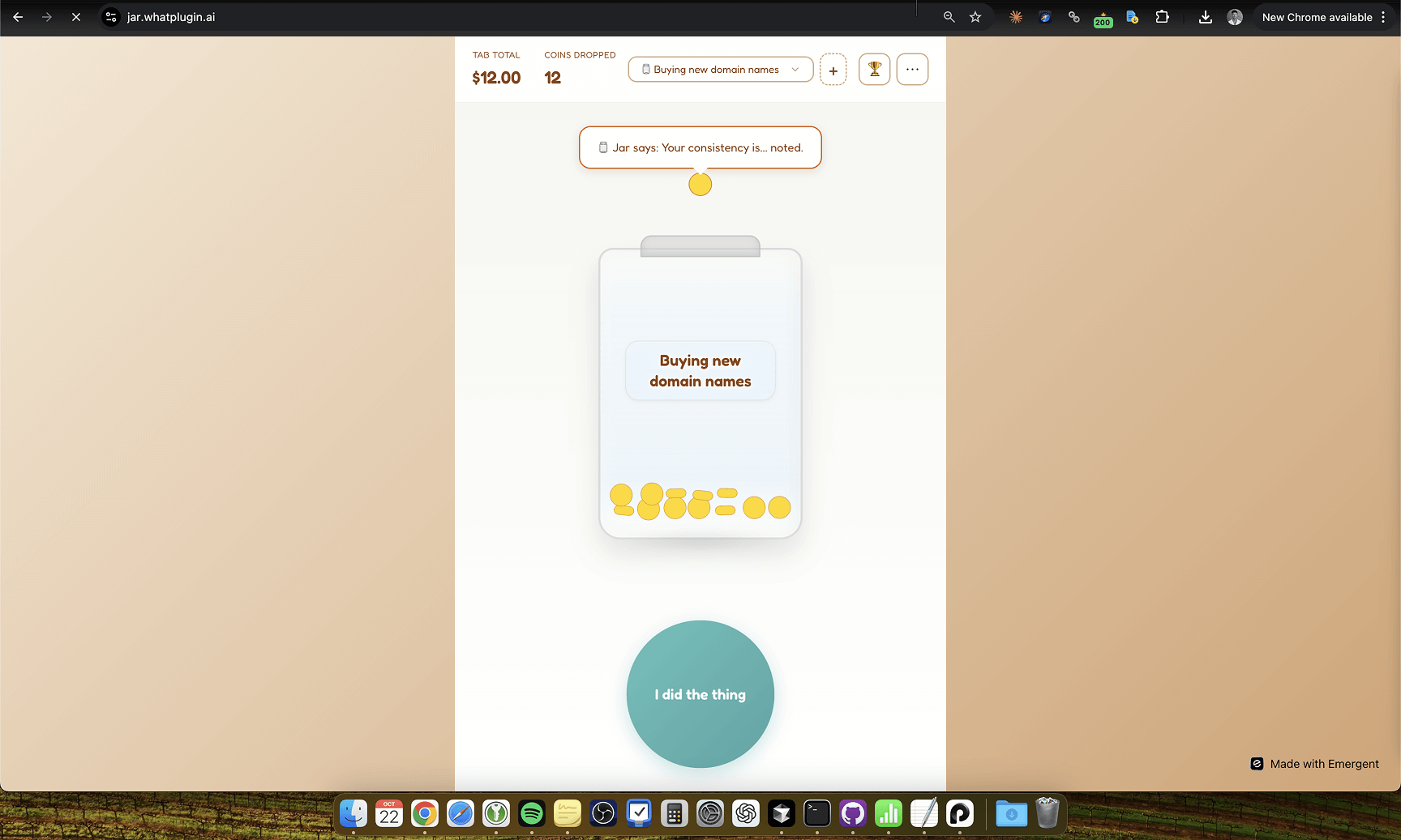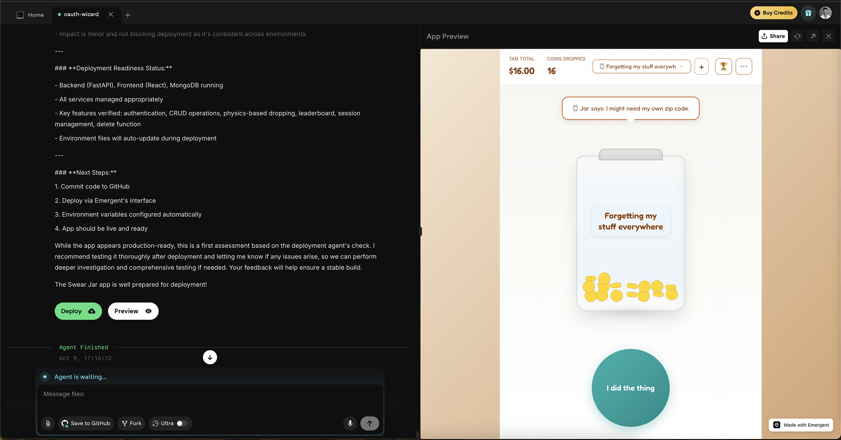 In this article I've partnered up with Emergent, an app builder which makes it very easy to ship a full stack app, and sits at the vibe coding end of the spectrum. To see whether Emergent can ship something real (not just a pretty mockup), I asked it to build a simple but fully functional digital swear jar—the type of jar used discourage people from using profanity. However, I wanted a version that can be used to keep track of (and make you pay up for) for any "bad habits" that you want to avoid. I wanted functionality like user sign in, possibility to create more than one jar, an animation for dropping coins, playful messages and, last but not least, a live leaderboard where you can see what other users are tracking and how much damaged they've done. I didn't want to implement any kind of payment, but rather purely a tracking app where users hold themselves responsible.